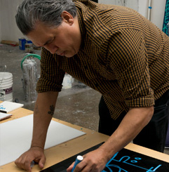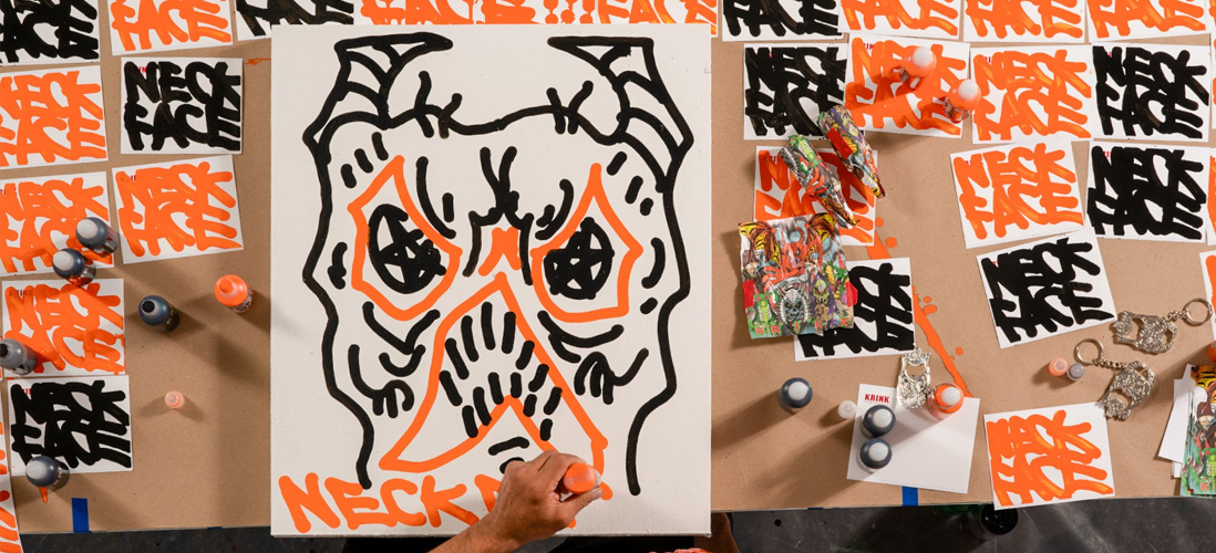 He started around 1996 by making stickers and putting them up in Stockton and Lodi, California. Then his work spread to San Francisco. The attention he received from his street work allowed him to move into art galleries. Neck Face's first gallery show was in 2004 when he was 18 years old, sponsored by Rich Jacobs and held at New Image Art gallery in West Hollywood, California. He's shown in the New Image Art Gallery in Los Angeles, the Luggage Store Gallery in San Francisco, One Grand Gallery in Portland, the Dactyl Foundation in New York, and the OHWOW Gallery in Miami. As a skateboarder, Neck Face has helped design for Baker Skateboards, and is the Art Director for Baker Skateboards. Neck Face has also collaborated with Vans, Stüssy and Altamont Apparel. His first skateboard art was for famous skateboarder Mark Gonzales. The then 18-year-old Neck Face was asked to provide a design for the Krooked board. After his first board with Gonzales he was introduced to Kevin 'Spanky' Long and started to create boards for him and the Baker skateboard brand.